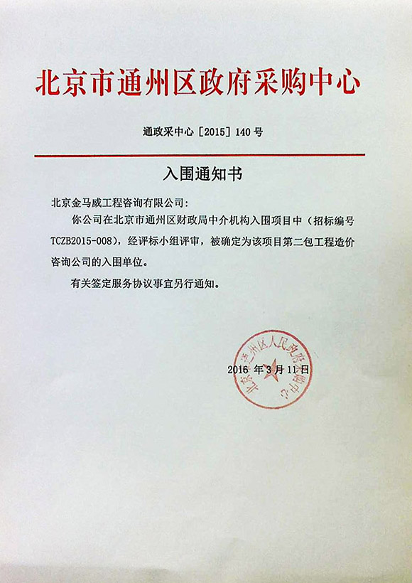 3月11日,經公開招標,公司入圍“北京市通州區財政局中介機構入圍評選采購項目”(招標編號:TCZB-2015-008)。據了解,一共有多家工程造價咨詢公司參與了投標,北京金馬威工程咨詢有限公司經評標小組評審,被確定為該項目第二包工程造價咨詢公司的入圍單位。